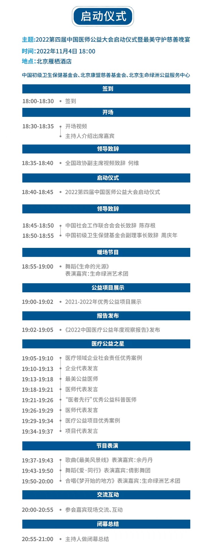 启动仪式上,大会将发布《2022中国医疗公益年度观察报告》,宣布2022寻找“医疗公益之星”活动成果,展示汇编入选的医疗领域企业社会责任优秀案例、最美公益医师、“医者先行”优秀公益科普医师、医疗公益项目优秀案例,并邀请关注和支持医疗公益事业的与会领导为其发放证书,以鼓励更多有志之士参与公益、慈善为民。